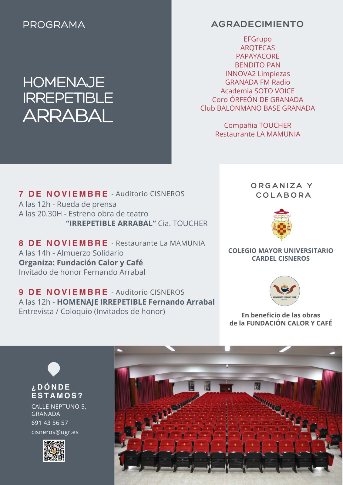- 14:00 h. Almuerzo solidario con el Invitado de Honor Fernando Arrabal, organizado por la Fundación Calor y Café. Evento en beneficio de las obras sociales de la Fundación Calor y Café.