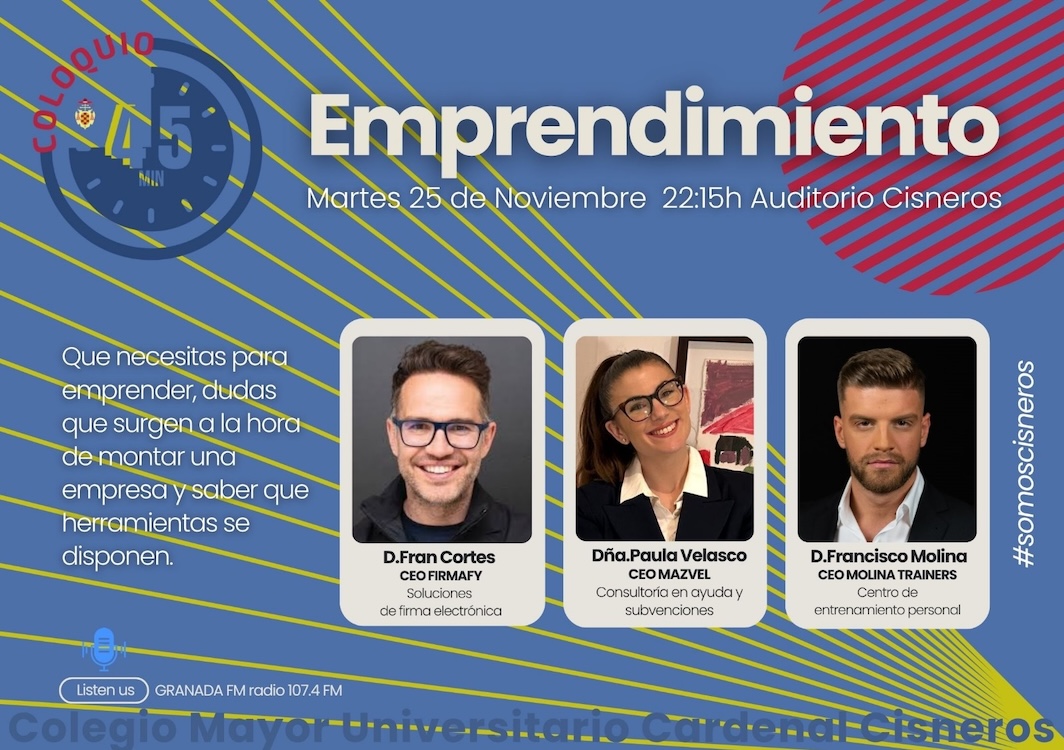Para dar respuesta a estas y muchas otras cuestiones, el Colegio Mayor Universitario Cardenal Cisneros organiza un coloquio abierto al público el martes 25 de noviembre a las 22:15 h en el Auditorio Cisneros, que reúne a tres jóvenes emprendedores con experiencia real en distintos sectores.