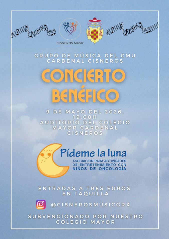 El evento, impulsado por el Grupo de música del CMU Cardenal Cisneros y financiado por el propio Colegio Mayor, tendrá lugar a las 19:00 horas en el Auditorio Cisneros y estará destinado a apoyar la labor de la Asociación Pídeme la Luna, entidad que trabaja con niños de oncología a través de actividades de entretenimiento, acompañamiento e ilusión, contribuyendo a mejorar su bienestar durante el proceso hospitalario.