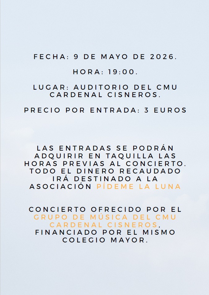 El evento, impulsado por el Grupo de música del CMU Cardenal Cisneros y financiado por el propio Colegio Mayor, tendrá lugar a las 19:00 horas en el Auditorio Cisneros y estará destinado a apoyar la labor de la Asociación Pídeme la Luna, entidad que trabaja con niños de oncología a través de actividades de entretenimiento, acompañamiento e ilusión, contribuyendo a mejorar su bienestar durante el proceso hospitalario.